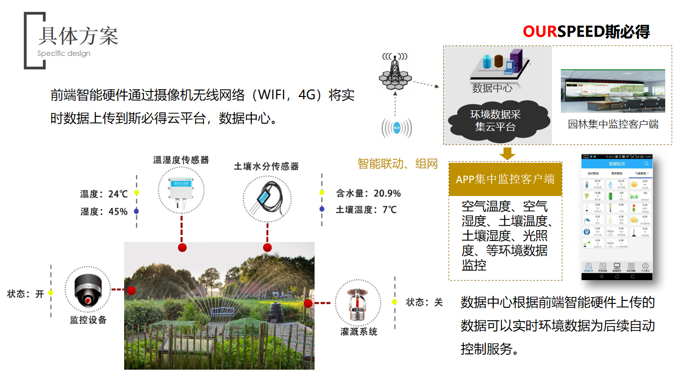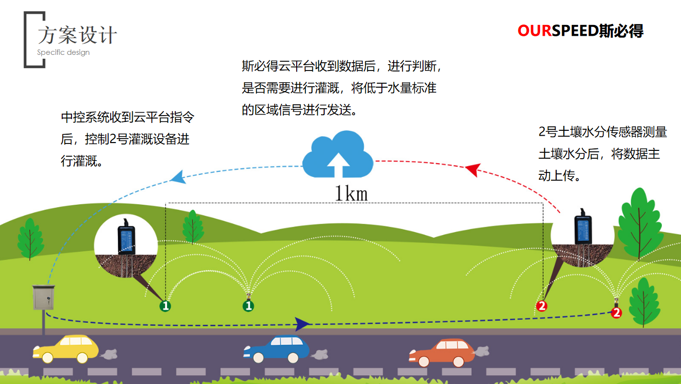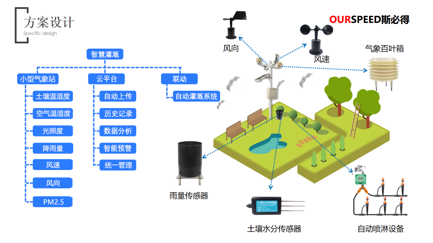 園林環境及墒情監測優勢:實現管理人員對園林各個區域的環境溫度、濕度、風速、光照、土壤水分等參數進行監測;對園林綠化業務全流程進行精細化管理,對環境變化可進行認為幹預,減少植物折損率;對園林噴灌用水量進行監控,為水資源利用提供有效的數據分析支持;根據土壤墒情及環境參數現狀建立用水量及灌溉方法數學模型。